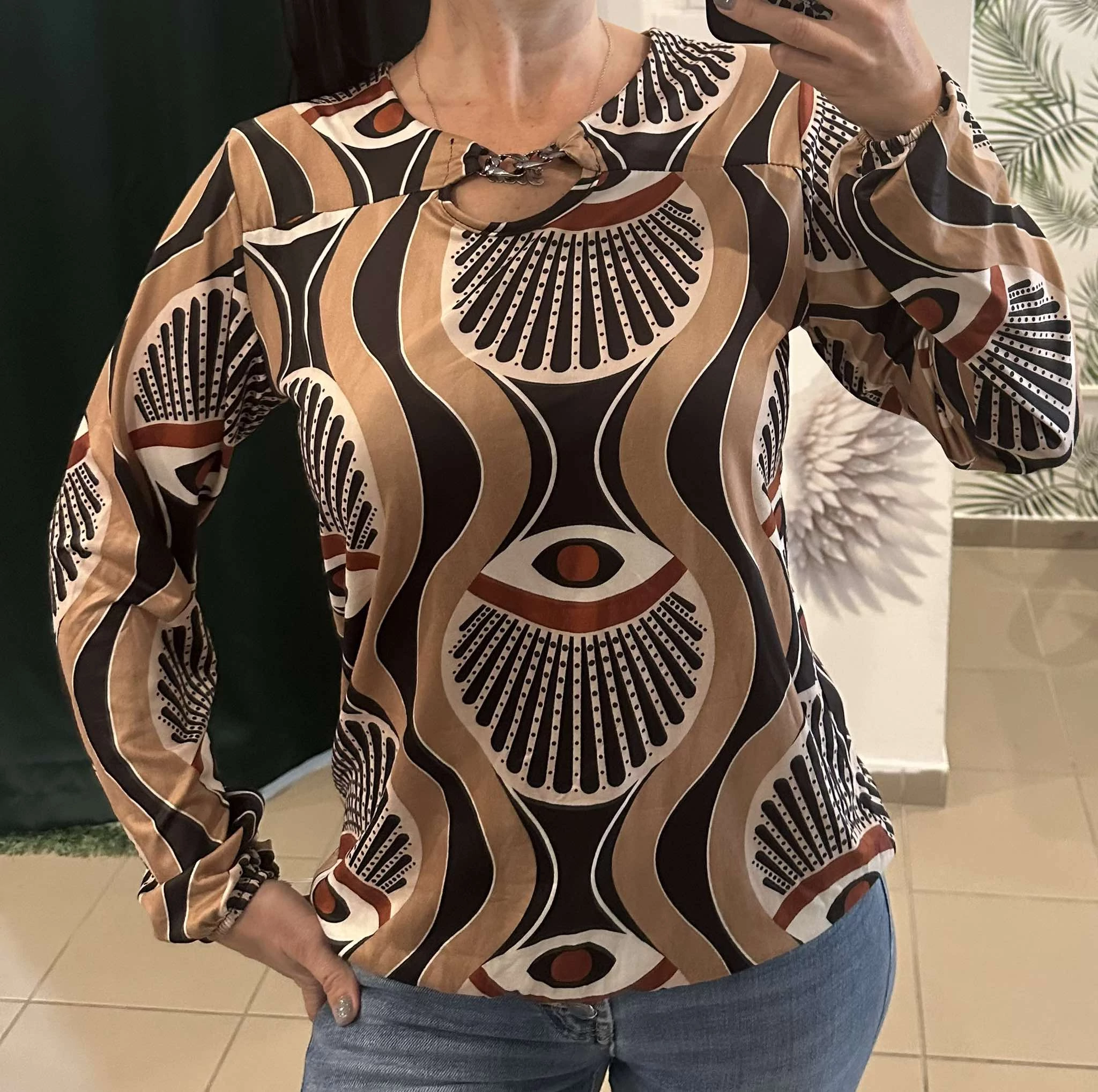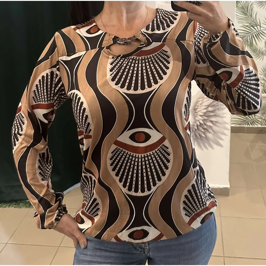 Hosszú ujjú barna, mintás felső, amely elegánsan divatos viselet alkalmakra.