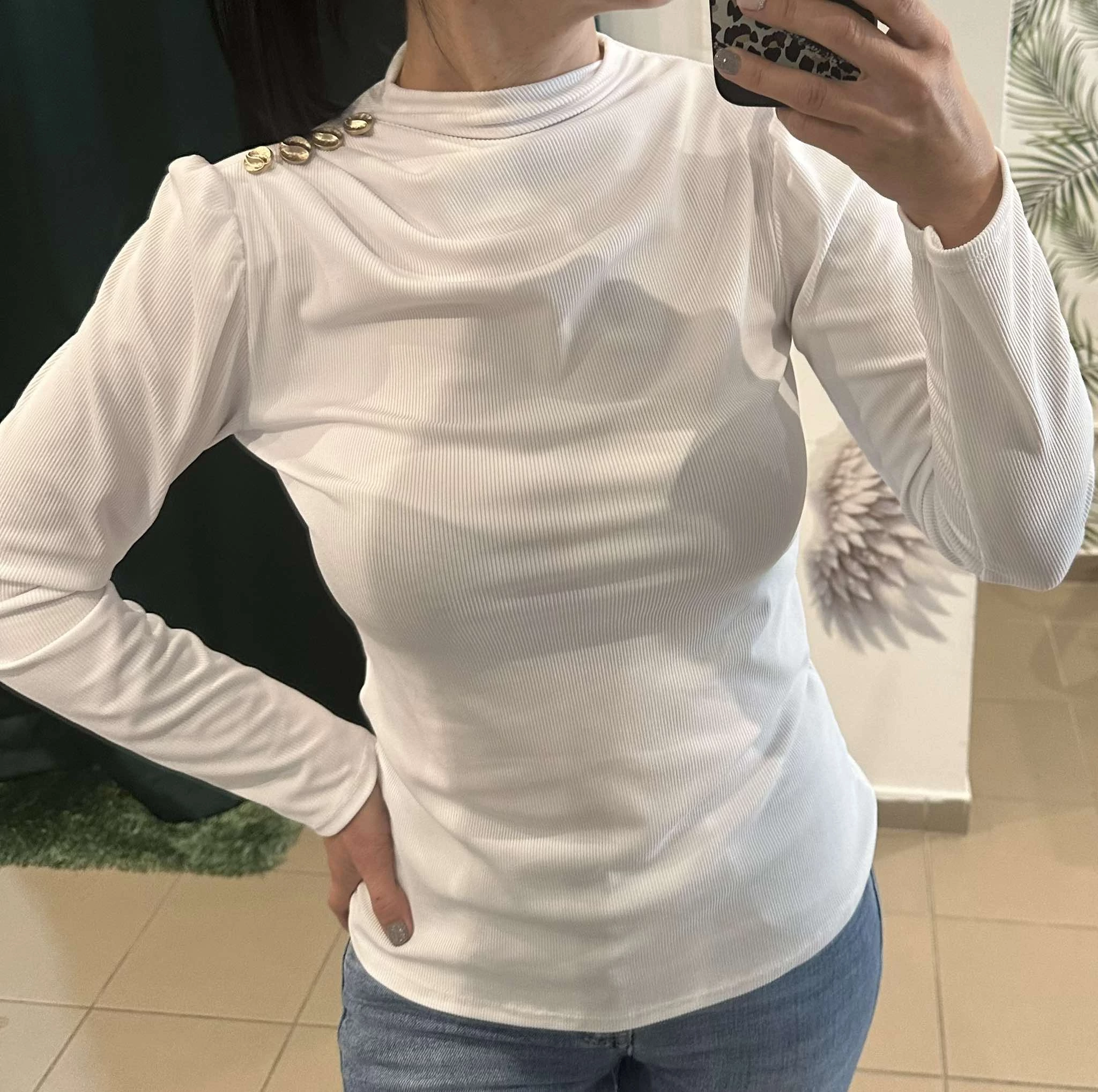 Egyszínű csinos felső, amit az egyik vállon gombos díszítés tesz különlegessé.