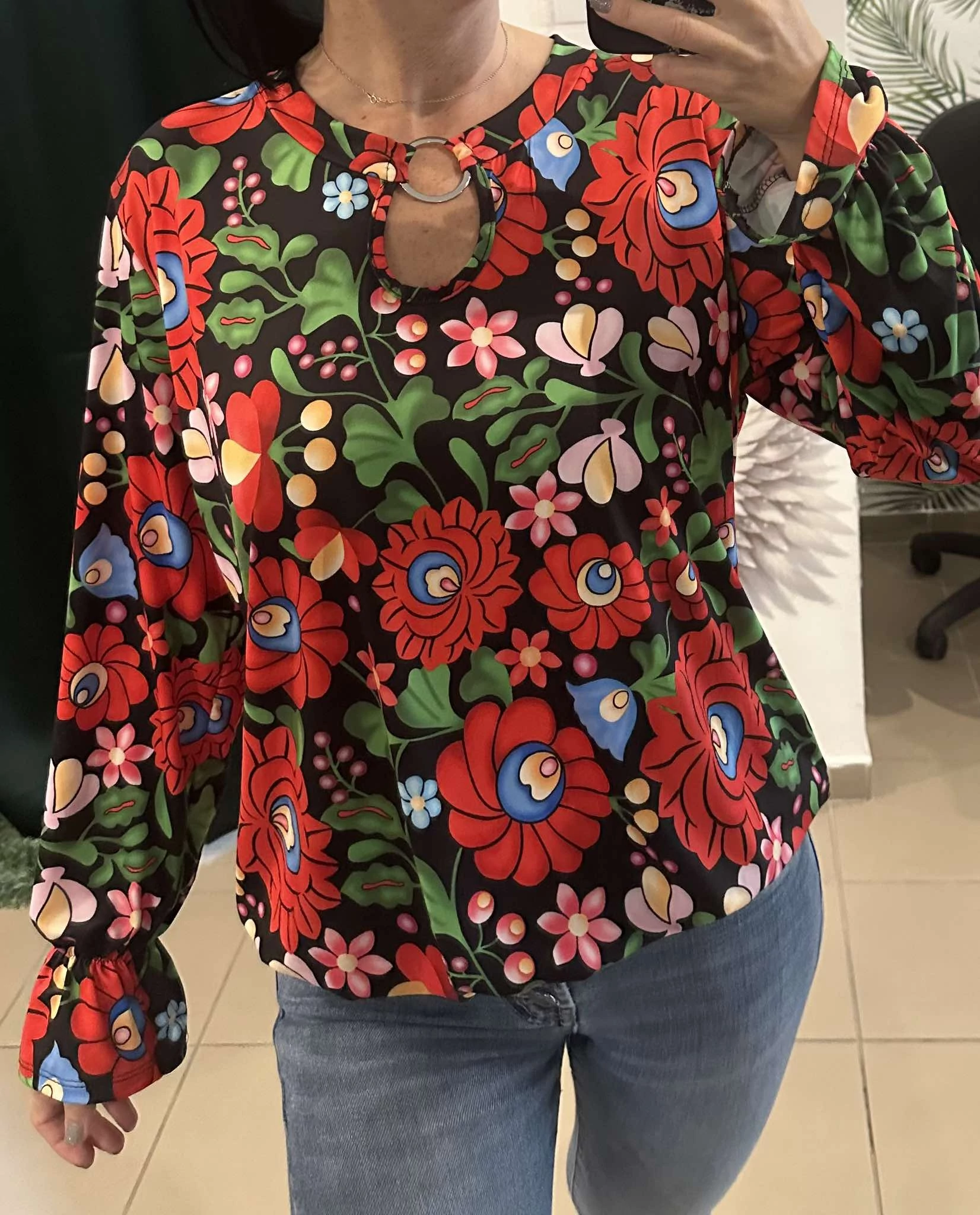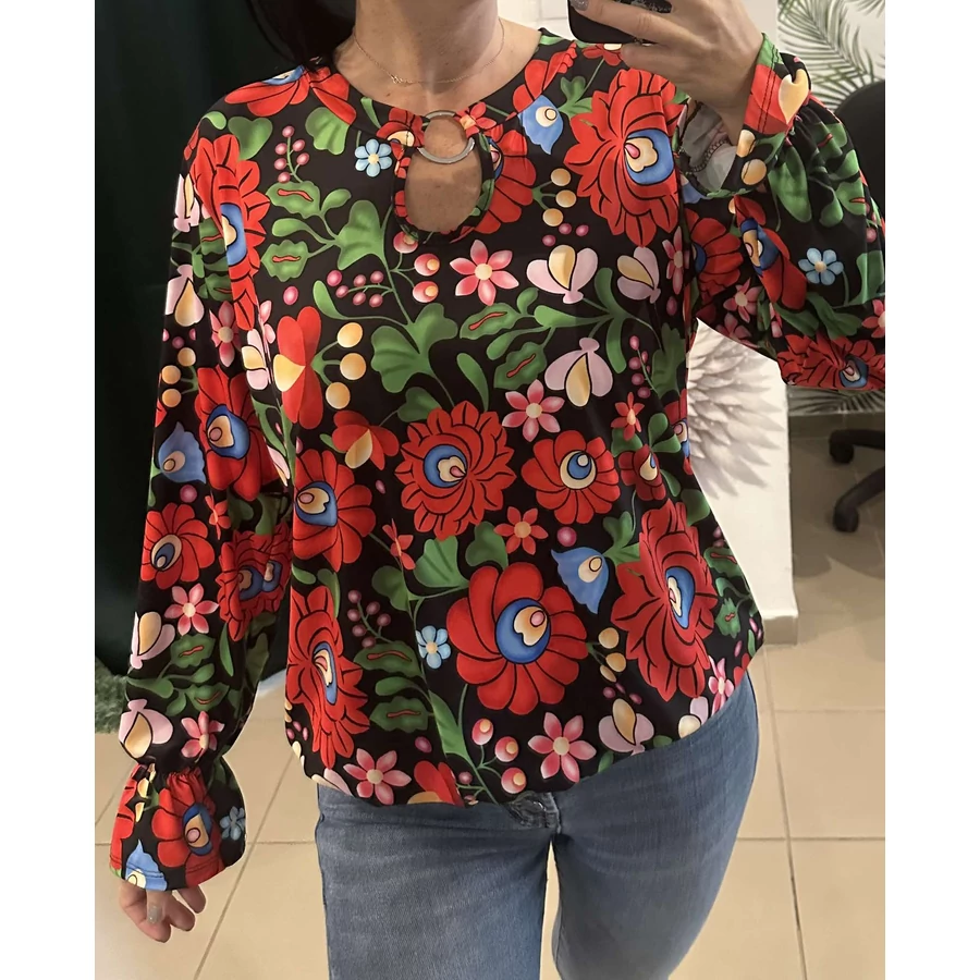 Matyó-mintás hosszú ujjú, gumis aljú felső, amely elegánsan divatos viselet alkalmakra.