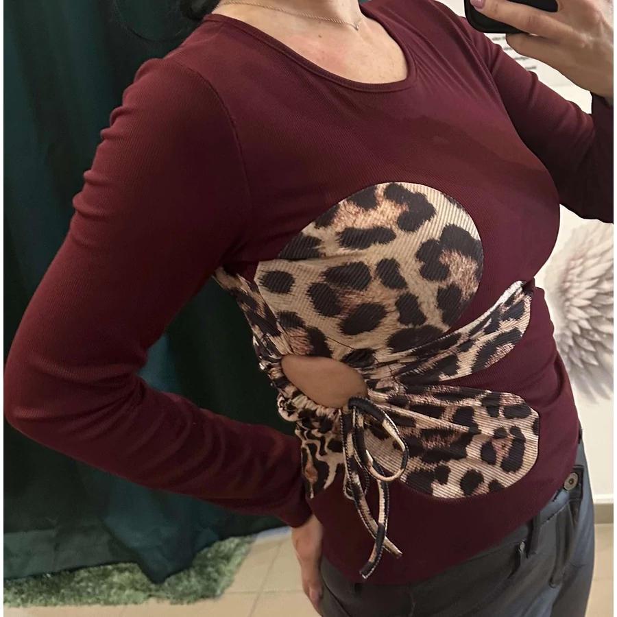 Fiatalos csinos bordó felső, oldalt felvágott, megkötős "párducvirág" mintával.